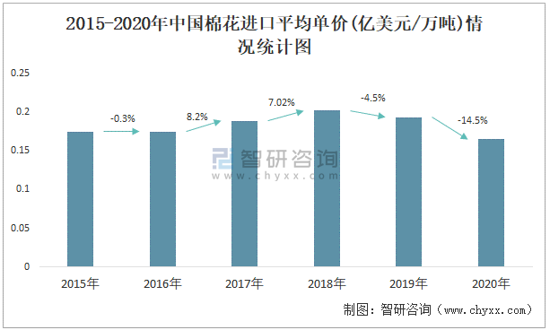 根據(jù)中國海關(guān)數(shù)據(jù)顯示:2015-2020年中國棉花進口數(shù)量與進口金額均在2016年跌至最低值,此后總體呈上升趨勢;2015-2020年中國棉花進口平均單價2017年增長速度最快,而2020年中國棉花進口平均單價下降速度最快,下滑了14.5%。