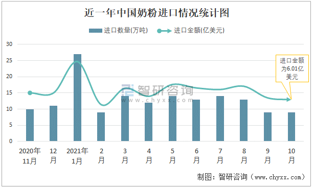 近一年中國奶粉進口情況統計圖