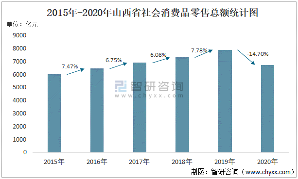 根據國家統計局數據可知:2015年-2020年山西省的社會消費品零售總額在2019年達到最高,為7909.2億元,其同比增幅也為2015年-2020年中最大,較2018年增長7.78%,2020年起下降14.7%,2019年山西省月均社會消費品零售總額為659.1億元。