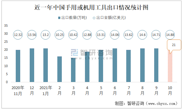 根據中國海關數據顯示:2021年10月中國手用或機用工具出口數量為21萬噸,同比增長15.3%,出口金額為14.88億美元,同比增長34.4%;2021年1-10月中國手用或機用工具出口數量為195萬噸,出口金額為131.87億美元。