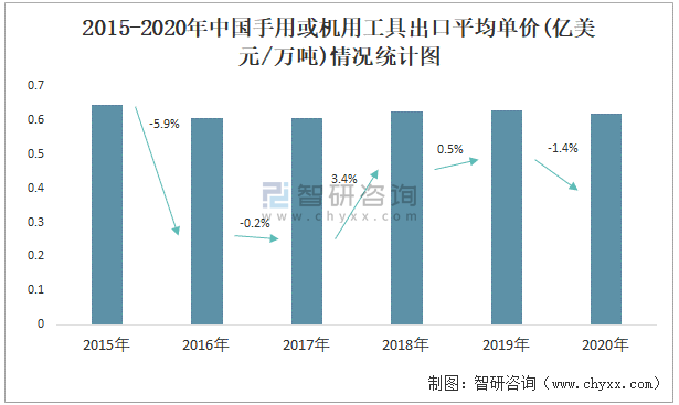 2015-2020年中國手用或機用工具出口平均單價(億美元/萬噸)情況統計圖