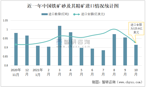 根據中國海關數據顯示:2021年10月中國鐵礦砂及其精礦進口數量為0.92億噸,同比下降14.1%,進口金額為125.6億美元,同比下降3.4%,2021年1-10月中國鐵礦砂及其精礦進口數量為9.33億噸,進口金額為1642.45億美元。