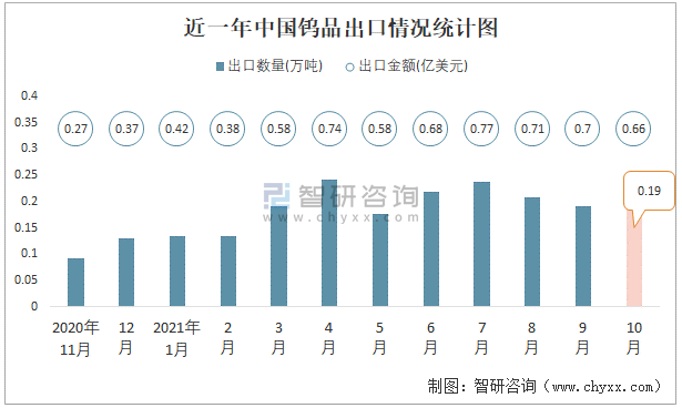 根據中國海關數據顯示:2021年10月中國鎢品出口數量為0.19萬噸,同比增長99.3%,出口金額為0.66億美元,同比增長142.6%;2021年1-10月中國鎢品出口數量為1.92萬噸,出口金額為6.24億美元。