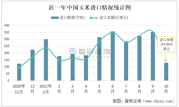 根據(jù)中國海關數(shù)據(jù)顯示:2021年10月中國玉米進口數(shù)量為130萬噸,同比增長14.2%,進口金額為4.04億美元,同比增長60.5%,2021年1-10月中國玉米進口數(shù)量為2623萬噸,進口金額為73.43億美元。