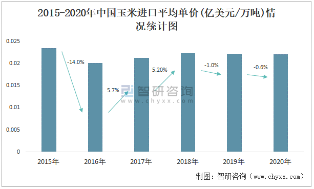 2015-2020年中國玉米進口平均單價(億美元/萬噸)情況統(tǒng)計圖