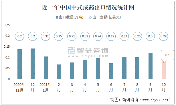 根據中國海關數據顯示:2021年10月中國中式成藥出口數量為0.1萬噸,同比增長5.9%,出口金額為0.29億美元,同比增長26.1%;2021年1-10月中國中式成藥出口數量為0.94萬噸,出口金額為2.47億美元。