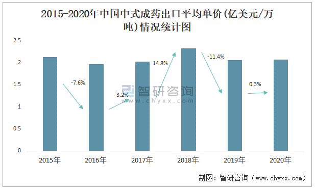 2015-2020年中國中式成藥出口平均單價(億美元/萬噸)情況統計圖