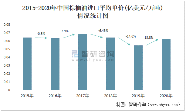 根據中國海關數據顯示:2015-2020年中國棕櫚油進口數量與進口金額均在2019年達到最大值,此后有所下降;2015-2020年中國棕櫚油進口平均單價2020年增長速度最快,而2019年中國棕櫚油進口平均單價下降速度最快,下滑了14.6%。