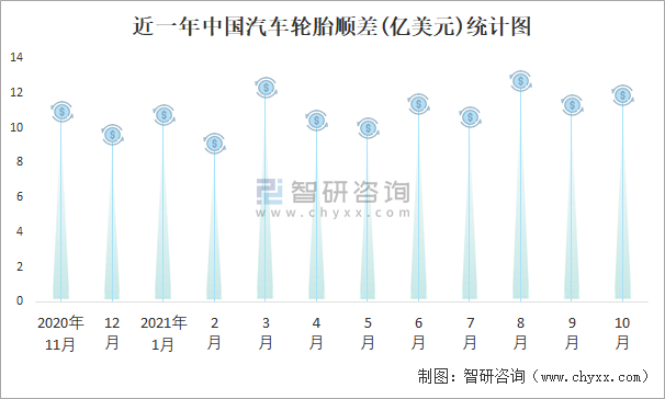 近一年中國(guó)汽車輪胎順差(億美元)統(tǒng)計(jì)圖