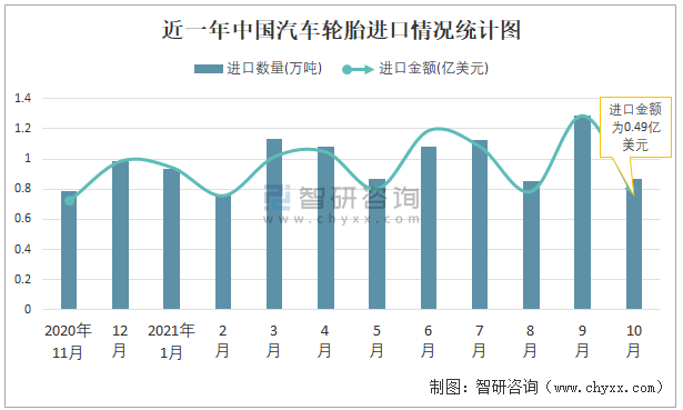 根據(jù)中國(guó)海關(guān)數(shù)據(jù)顯示:2021年10月中國(guó)汽車輪胎進(jìn)口數(shù)量為0.87萬(wàn)噸,同比下降2.7%,進(jìn)口金額為0.49億美元,同比下降3.3%,2021年10月中國(guó)汽車輪胎出口數(shù)量為53.11萬(wàn)噸,同比下降0.1%,出口金額為12.39億美元,同比增長(zhǎng)9.3%;2021年1-10月中國(guó)汽車輪胎進(jìn)口數(shù)量為10萬(wàn)噸,進(jìn)口金額為6.21億美元,出口數(shù)量為504.54萬(wàn)噸,出口金額為116.5億美元。
