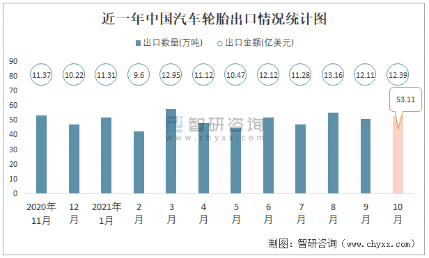 近一年中國(guó)汽車輪胎出口情況統(tǒng)計(jì)圖