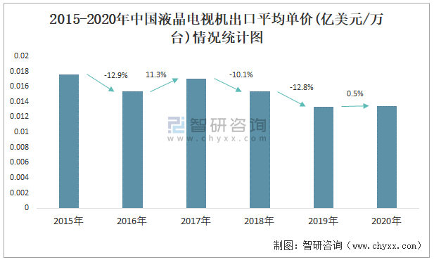 2015-2020年中國液晶電視機出口平均單價(億美元/萬臺)情況統(tǒng)計圖