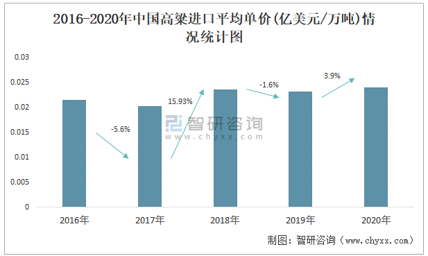 根據(jù)中國海關(guān)數(shù)據(jù)顯示:2016-2020年中國高粱進(jìn)口數(shù)量與進(jìn)口金額均在2019年跌至最低值,此后大幅度上升;2016-2020年中國高粱進(jìn)口平均單價(jià)2018年增長(zhǎng)速度最快,而在2017年下滑速度最快,下滑了5.6%。