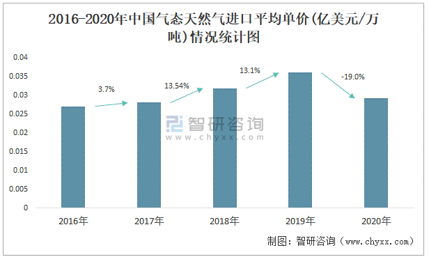 2016-2020年中國氣態天然氣進口平均單價(億美元/萬噸)情況統計圖