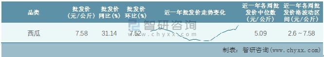 根據農村農業部數據統計可知:2022年第2周全國西瓜平均批發價為7.58元/公斤,同比增加31.14%,環比增加7.52%,近一年全國西瓜平均批發價最高達到7.58元/公斤,作為季節性水果,西瓜價格的低洼值集中在夏季,批發價最低為2.6元/公斤。