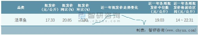 根據農村農業部數據統計可知:2022年第2周全國活草魚平均批發價為17.33元/公斤,同比增加20.85%,環比下跌0.8%,近一年全國活草魚平均批發價最高達到22.31元/公斤,批發價最低也要14元/公斤。