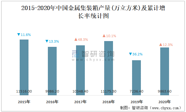2015-2020年中國(guó)金屬集裝箱產(chǎn)量及累計(jì)增長(zhǎng)率統(tǒng)計(jì)圖