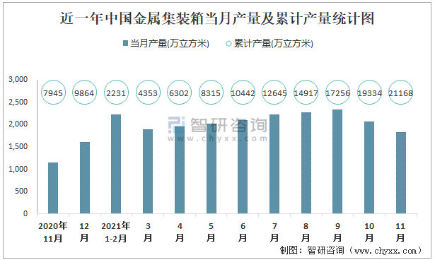 近一年中國(guó)金屬集裝箱當(dāng)月產(chǎn)量及累計(jì)產(chǎn)量統(tǒng)計(jì)圖