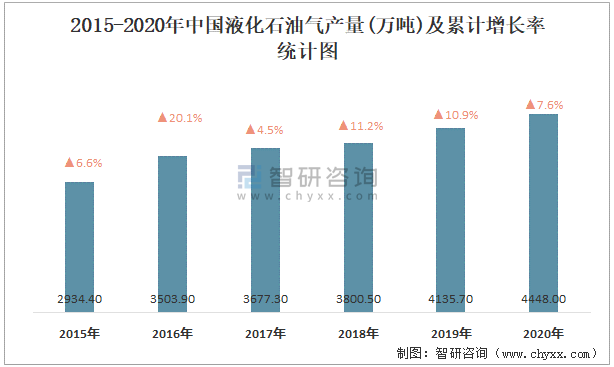 2015-2020年中國液化石油氣產量及累計增長率統計圖