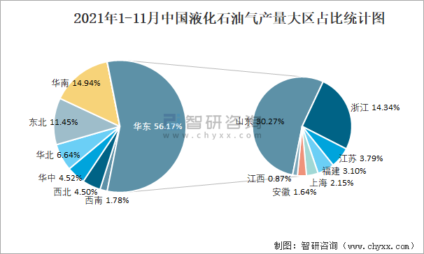 2021年1-11月中國液化石油氣產量為4387.3萬噸 華東地區產量最高(占比56.2%)