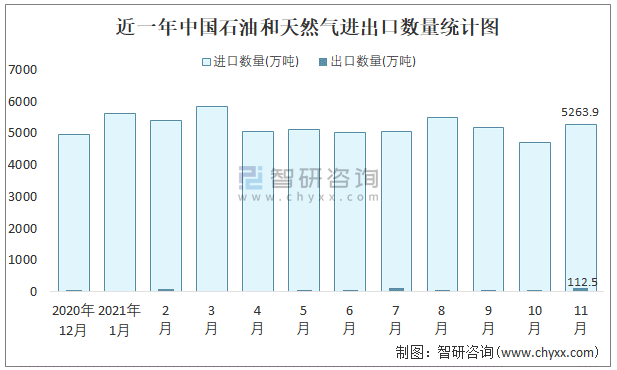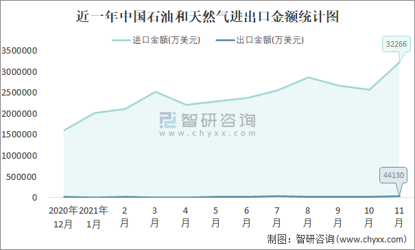 根據中國石油和化學工業聯合會數據顯示:2021年11月中國石油和天然氣進口數量為5263.9萬噸,出口數量為112.5萬噸;進口金額為3226686萬美元,出口金額為44130萬美元;近一年中國石油和天然氣出口總金額小于進口總金額,貿易逆差為主,進口均價613美元/噸。
