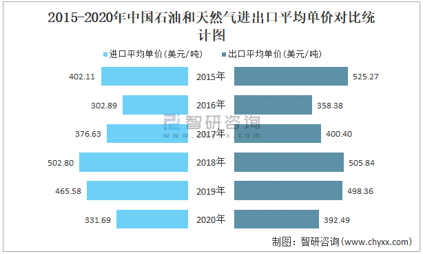 2015-2020年中國石油和天然氣進出口平均單價對比統計圖