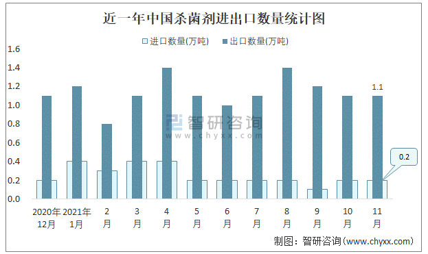 近一年中國殺菌劑進出口數量統計圖