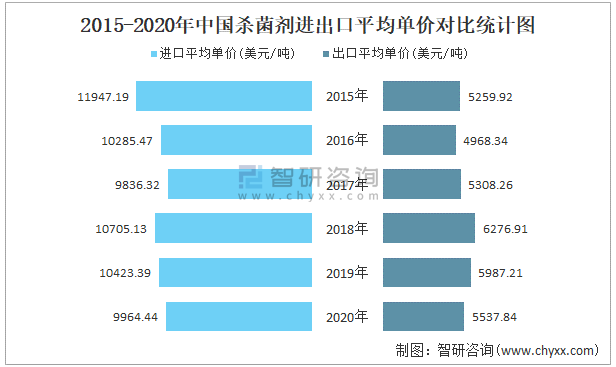 2015-2020年中國殺菌劑進出口平均單價對比統計圖