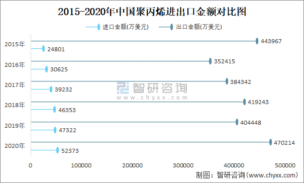 2015-2020年中國聚丙烯進出口金額對比統(tǒng)計圖