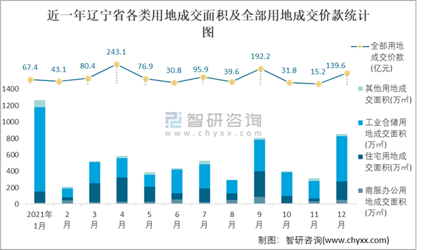 近一年遼寧省各類用地成交面積及全部用地成交價款統計圖