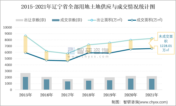 2015-2021年遼寧省全部用地土地供應與成交情況統計圖