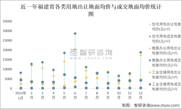 近一年福建省各類用地出讓地面均價與成交地面均價統(tǒng)計圖