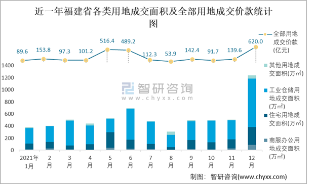 近一年福建省各類用地成交面積及全部用地成交價款統(tǒng)計圖