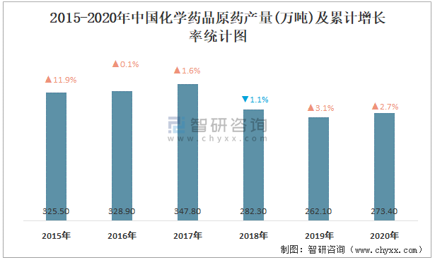 2015-2020年中國化學藥品原藥產量及累計增長率統計圖
