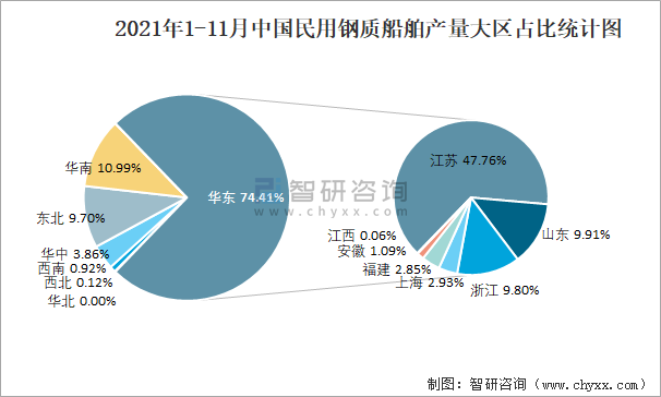 2021年1-11月中國民用鋼質船舶產量大區占比統計圖