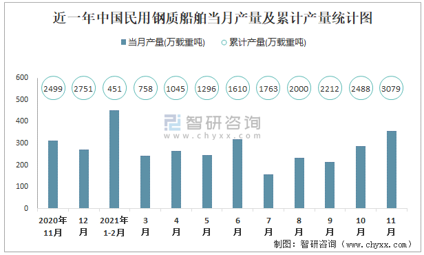 根據國家統計局數據顯示:2021年11月中國民用鋼質船舶產量為357萬載重噸,同比增長9.6%;2021年1-11月中國民用鋼質船舶累計產量為3079.4萬載重噸,累計增長11.6%;2015-2020年中國民用鋼質船舶產量2015年達到最高,此后總體呈現下降趨勢。