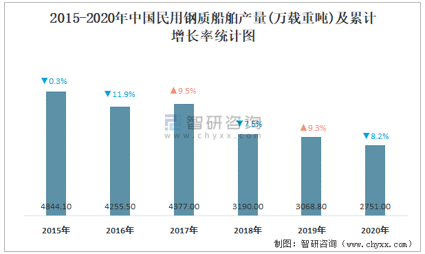 2015-2020年中國民用鋼質船舶產量及累計增長率統計圖