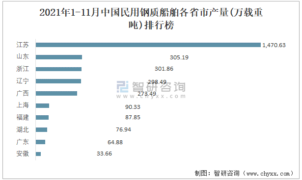 2021年1-11月中國民用鋼質船舶各省市產量排行榜