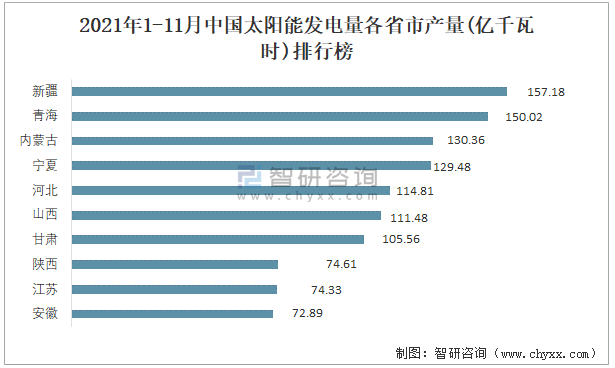 2021年1-11月中國太陽能發電量各省市產量排行榜