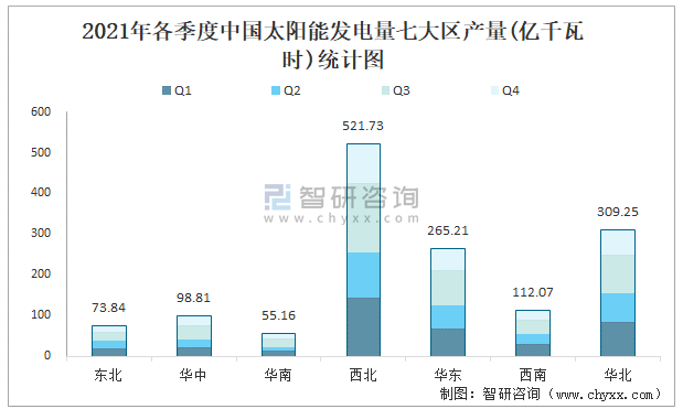 2021年各季度中國太陽能發電量七大區產量統計圖