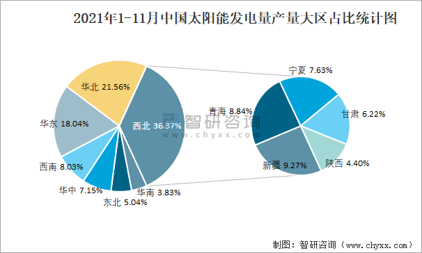 2021年1-11月中國太陽能發電量產量大區占比統計圖