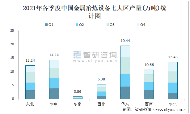 2021年各季度中國金屬冶煉設備七大區產量統計圖