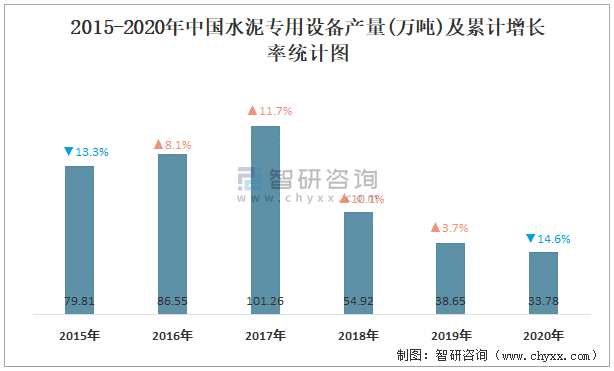 2015-2020年中國水泥專用設備產量及累計增長率統計圖
