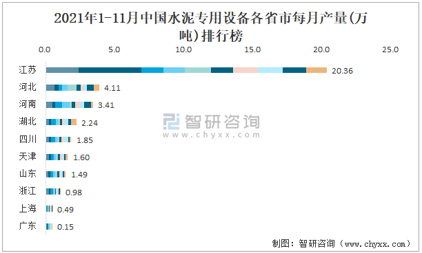 2021年1-11月中國水泥專用設備各省市每月產量排行榜
