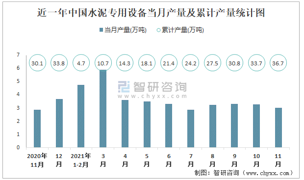 近一年中國水泥專用設備當月產量及累計產量統計圖