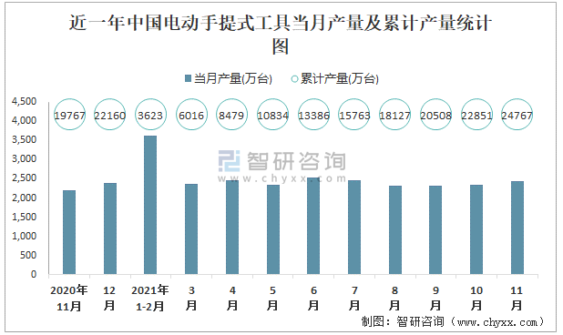 近一年中國電動手提式工具當月產量及累計產量統計圖