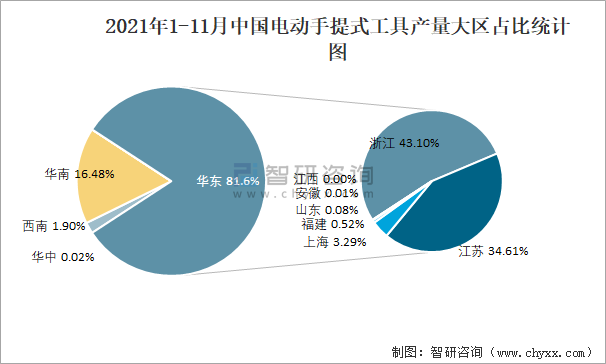 2021年1-11月中國電動手提式工具產量大區占比統計圖