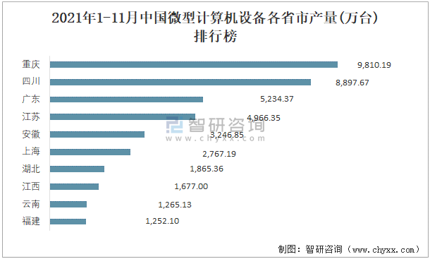 根據國家統計局數據顯示:2021年各季度中國微型計算機設備主要集中在西南、華東、華南地區生產;2021年1-11月中國微型計算機設備產量大區分布不均衡,其中西南地區產量最高,特別是重慶市貢獻了最多產量;2021年1-11月中國微型計算機設備各省市產量呈現梯隊式分布,重慶、四川、廣東等省市產量最多。