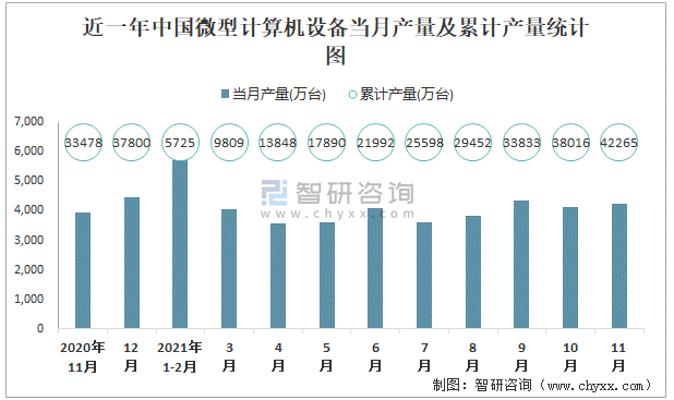 根據國家統計局數據顯示:2021年11月中國微型計算機設備產量為4233萬臺,同比增長7.5%;2021年1-11月中國微型計算機設備累計產量為42264.7萬臺,累計增長24%;2015-2020年中國微型計算機設備產量2016年跌至最低,此后逐年遞增。
