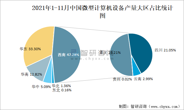 2021年1-11月中國微型計算機設備產量為42264.7萬臺 西南地區產量最高(占比47.3%)
